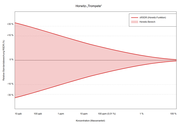 Diese Gesetzmäßigkeit wird als „Horwitz-Trompete“ bezeichnet, da sie grafisch wie ein Trichter aussieht: