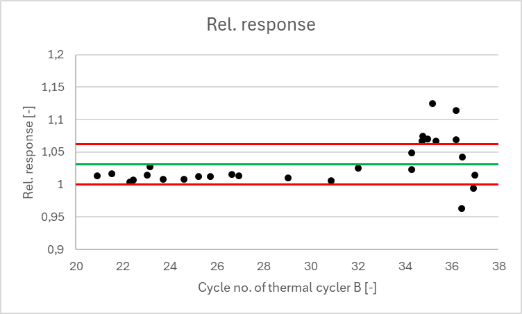 Evaluating the data using the relative response, we can see, that the values are outside the (self-selected!) limits starting from a Ct value of 34.73, while an examination of the residual plot already reveals a clear abnormality beginning with the Ct value of 32. This indicates that the linear model is no longer suitable for this part of the data.