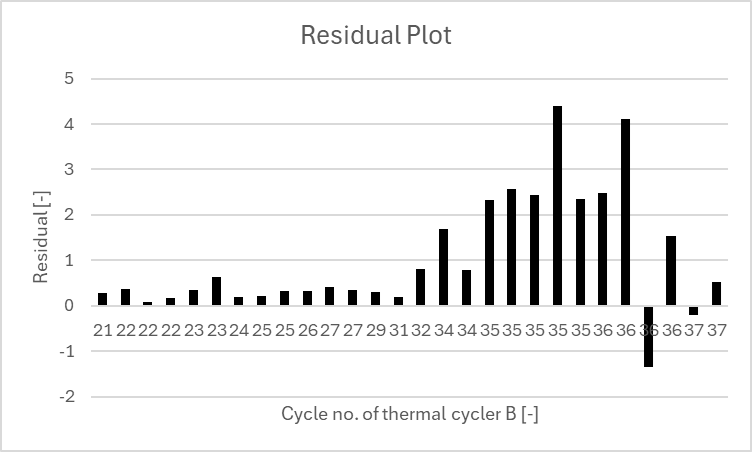 Since we’ve plotted the Ct values of thermal cycler A against B, the Ct values of thermal cycler A act as y values and those of B as x values. The relative response is calculated as y/x, for the residual we subtract y-x.