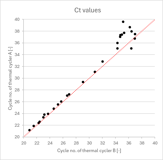 The closer the individual points are to the straight line, the more similar the sample results are for both thermal cyclers. However, it’s noticeable that the values start to scatter from a Ct value of approx. > 34.
